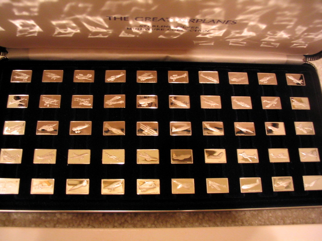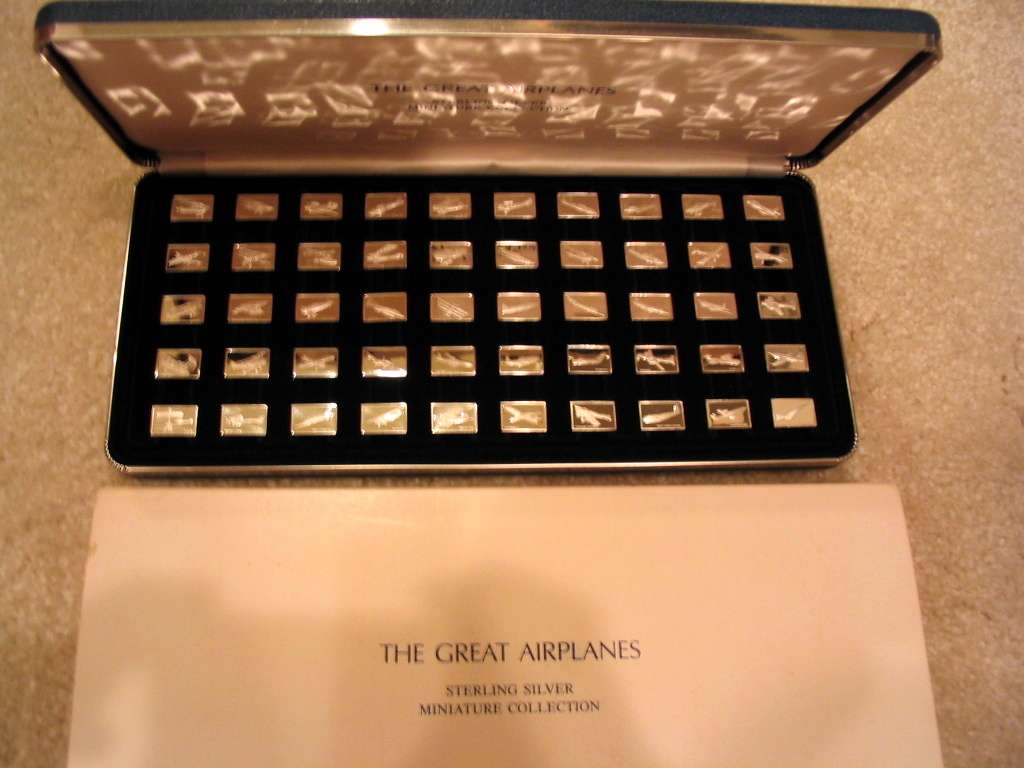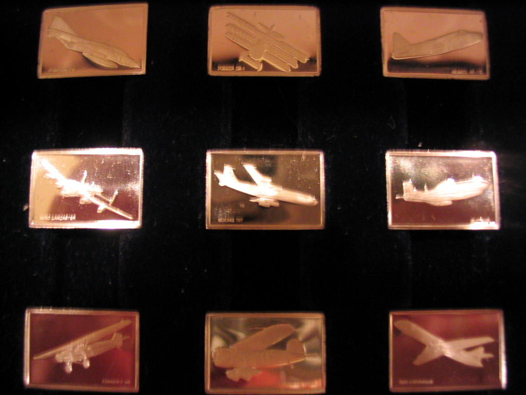 The mini ingot Airplanes set is seen often, unlike the full size Airplanes ingot set which is much rarer. The Franklin Mint issued a number of different airplane-related ingot sets, see also Air and Space, Airline Emblems, and Airline Tail Emblems. The largest and most comprehensive set is the History of Flight.