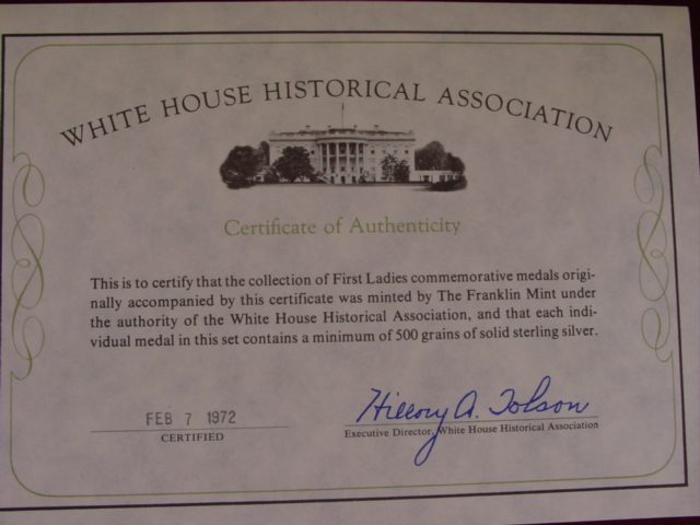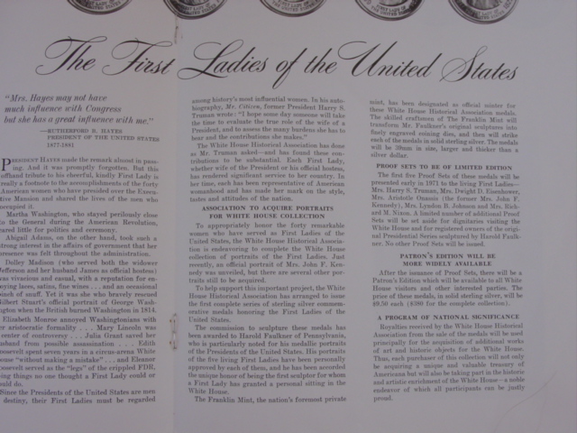 A White House Historical Association issue, this set honors the First Ladies and is a companion to the Presidents set. This set came in two different album styles - a book style album with mylar sheets over the medals and a fancier cabinet style album with the medals in plastic capsules. The cabinet style is very rare.