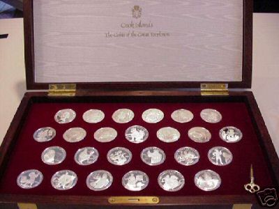 This set was minted for the Cook Islands, and each coin has a face value of $50. Impressive heavy wooden display case looks like a treasure chest.