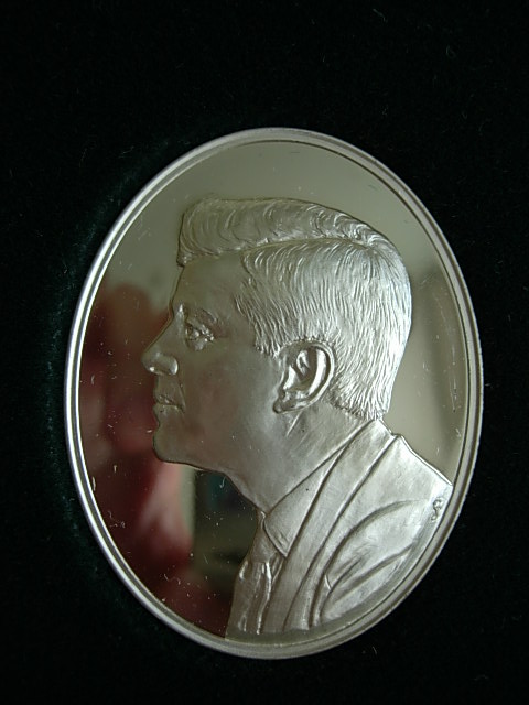 This set has oval medals instead of round. It is in a picture frame mounting - a very nice one - intended to hang on the wall. It also came with a special leather bound copy of Kennedy's book Profiles in Courage. I have only seen one of the solid gold sets ever.