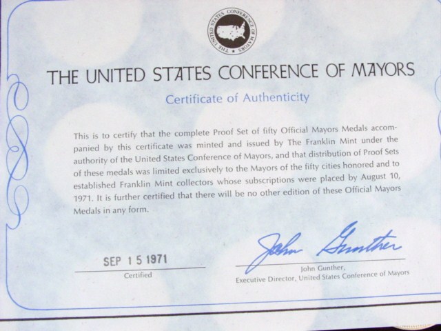 This set is very similar to the Governor's Edition of the States of the Union medals, but features the 50 largest U.S. cities instead of states. This set was issued only in the large size, not in all the variations of the States of the Union set. Very attractive.