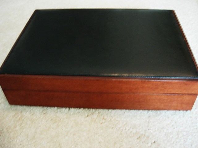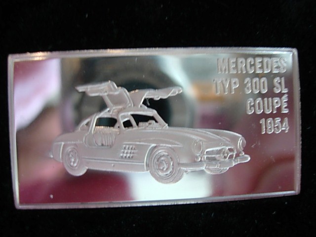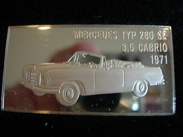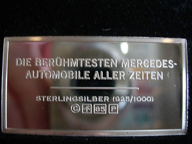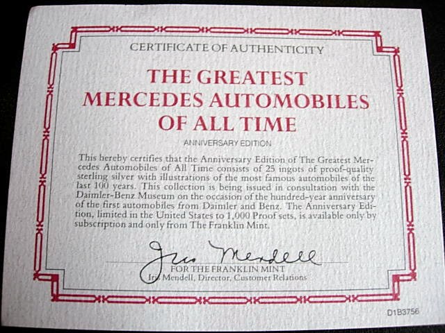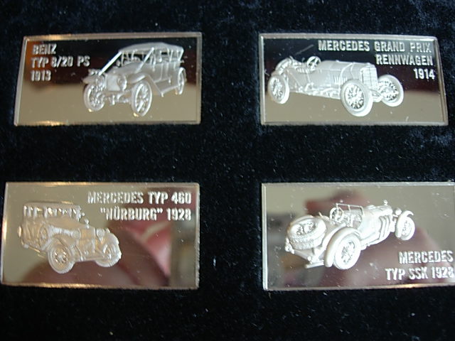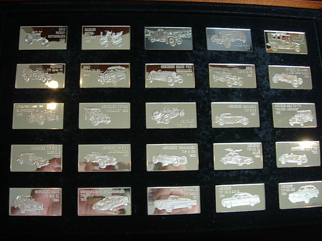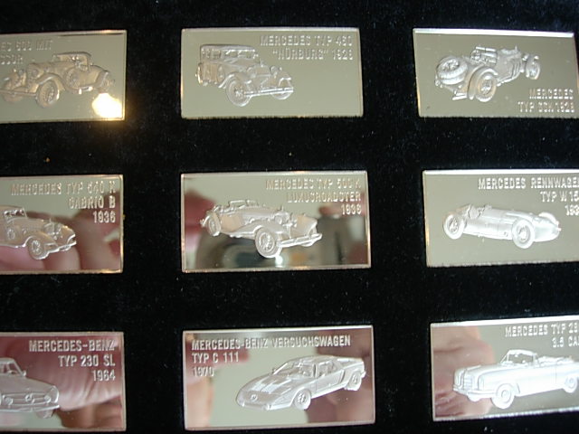 The most impressive thing about this set is the display case - beautiful walnut with a black leather top, claimed to be the same leather used in Mercedes automobiles. The Franklin Mint issued a number of different automobile-related ingot sets, see also Centennial Car, Centennial Car Mini, Classic Cars, Classic Cars Mini, Automobile Emblems, Racing Cars, and Great Performance Cars.