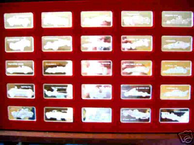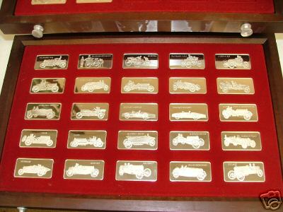 Very attractive set in very nice 3 drawer display chest. The Franklin Mint issued a number of different automobile-related ingot sets, see also Centennial Car, Centennial Car Mini, Classic Cars, Classic Cars Mini, Automobile Emblems, and Great Performance Cars.