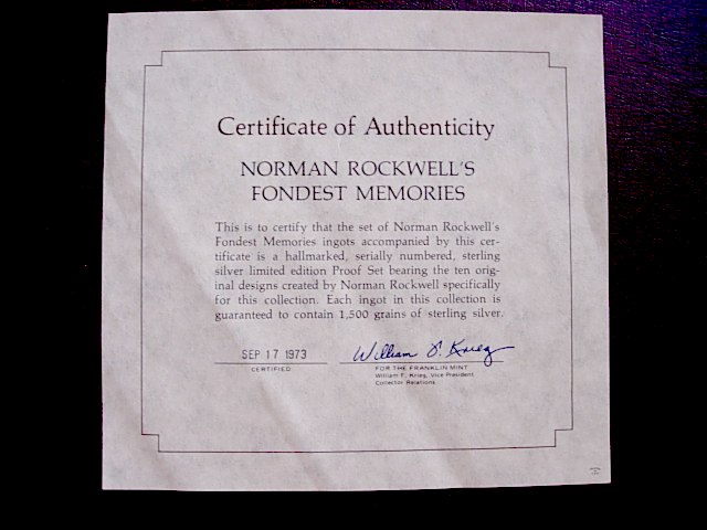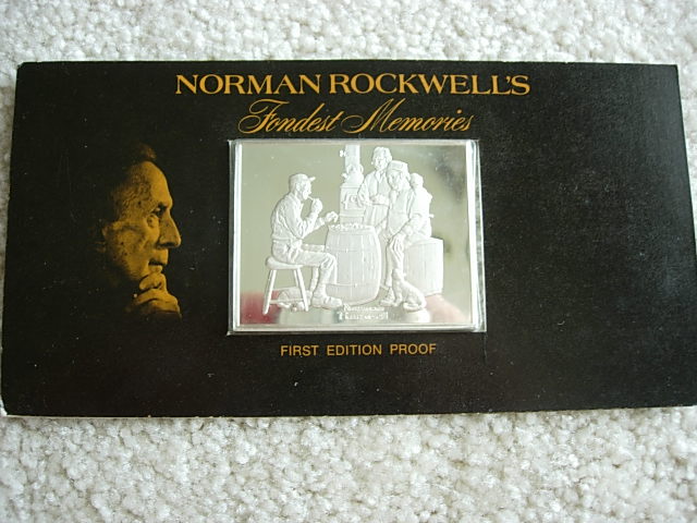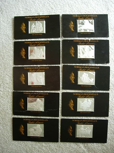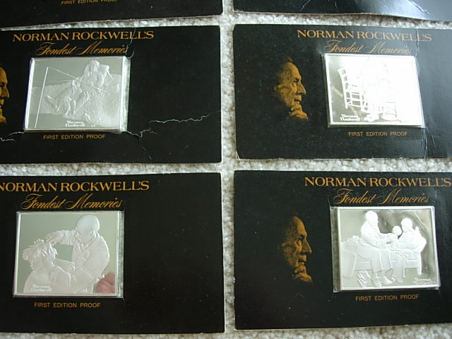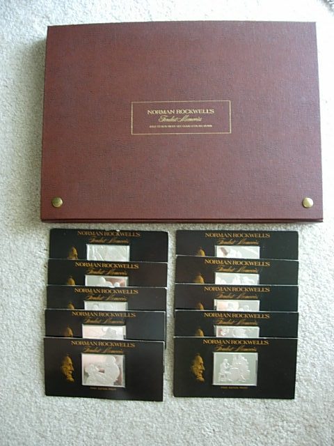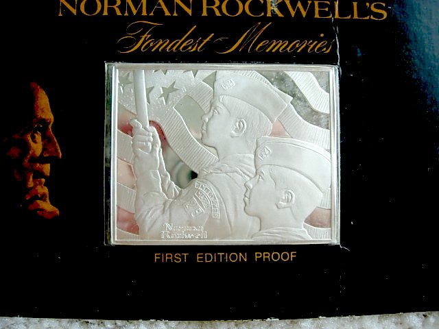 The Franklin Mint produced a number of original works of art by Norman Rockwell. See also Rockwell Boy Scouts, Rockwell Girl Scouts, Rockwell Robert Frost, and Rockwell Mark Twain. This set has large ingots with original Norman Rockwell designs. Mintage was high for a Franklin Mint set, so it is not difficult to find. The set was originally issued in 1973 and later re-issued in 1976, but the preponderance of the mintage is from the first edition.