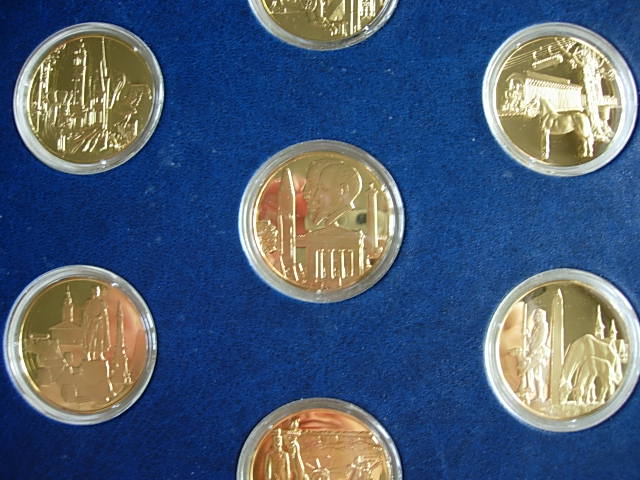 Similar to the States of the Union set, but with montage designs for each state. This set was issued just as the price of silver spiked in 1979, and so was quite expensive. Mintage figures are not available but were likely quite small - this set is very rarely seen. This is one of the last larger, multi-year sets issued by the Franklin Mint. This set was originally planned to be issued in multiple versions like the States of the Union set (39mm Governor's Edition, 32mm Standard Edition, and 10mm Mini Edition), but - I believe because of the high price of silver and consequently of the set - only the Governor's Edition in gold on sterling was actually issued, and the weight was reduced from a planned 500 grains per medal to 300 grains.