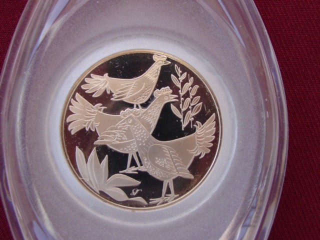 These are Franklin Mint medals, embedded in Christmas tree ornaments. The ornaments could be opened and closed. The medals feature designs from the "12 Days of Christmas" and have a verse from the song on the back. The nickle silver edition was issued in 1967 in multi-colored plastic ornaments. The silver and bronze versions were issued in 1970 in clear lucite ornaments.