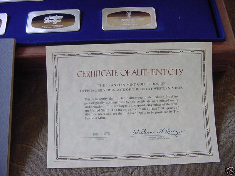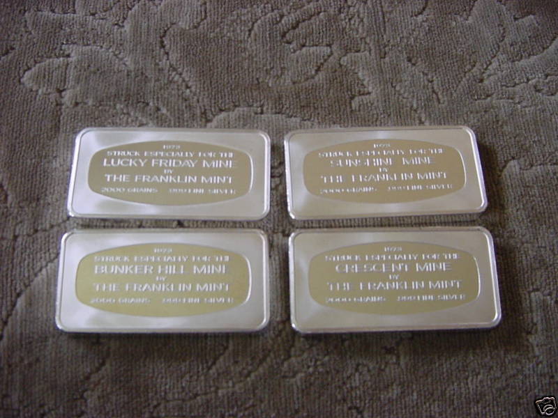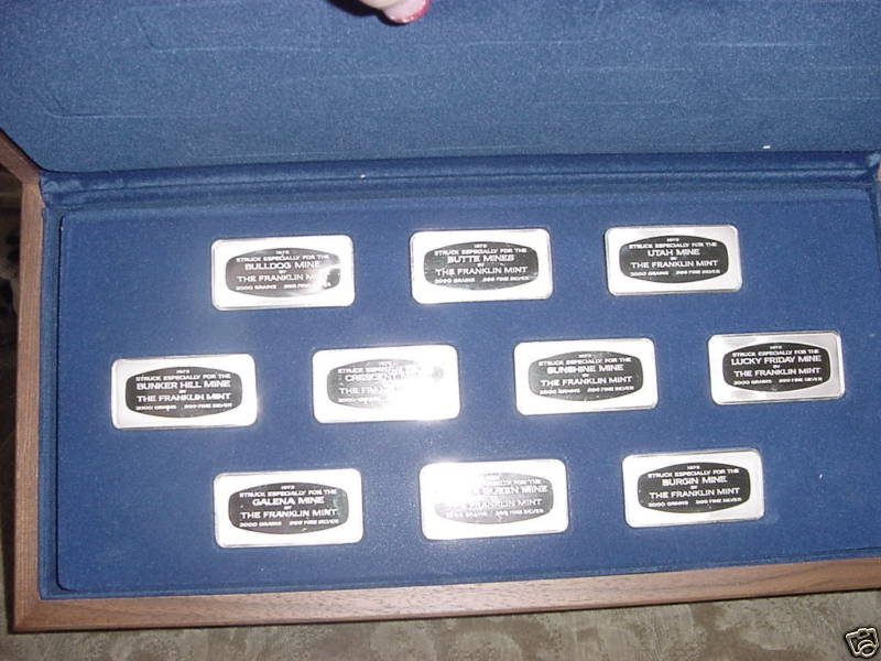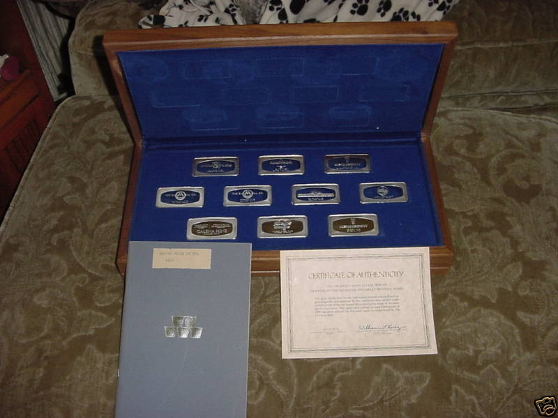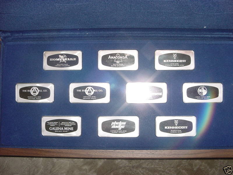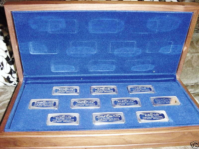 This collection of 10 large ingots commemorates the largest and best known silver mines in the western United States. At 4.16 oz each, these ingots are quite hefty, and make a very nice looking set in the wood display case. This is also one of the few sets minted in fine (.999) silver as opposed to sterling (.925) silver.