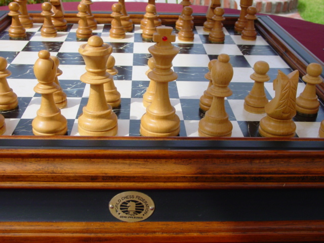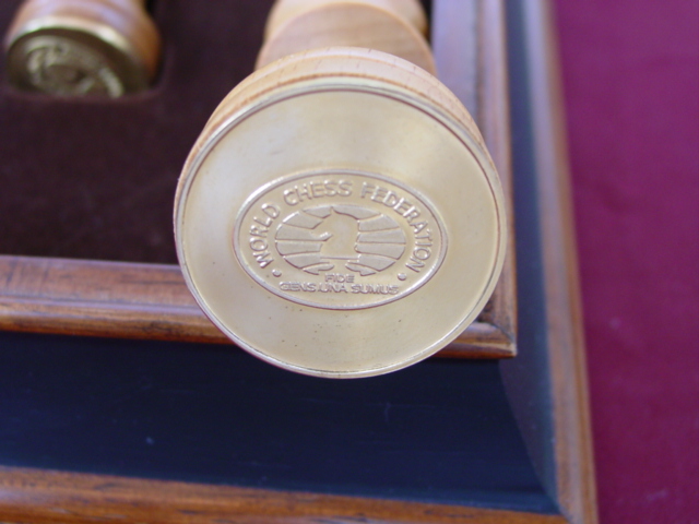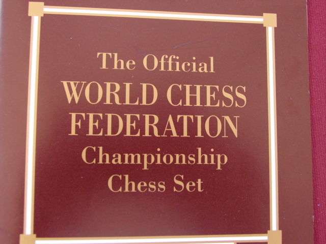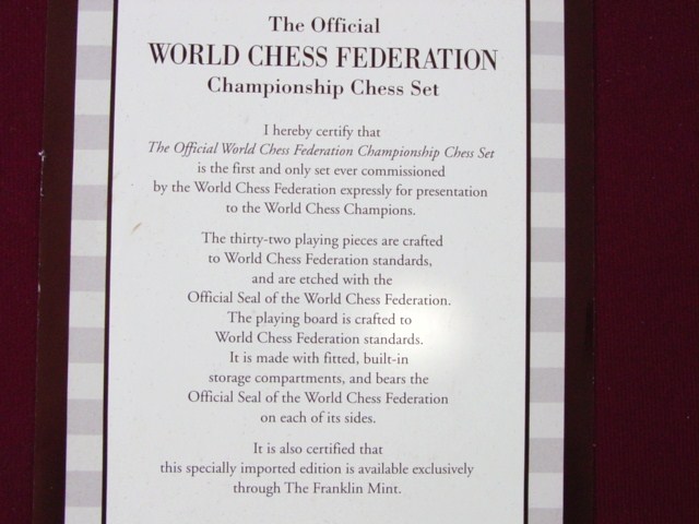 One of a series of Franklin Mint deluxe chess sets - this one features the World Chess Federation designs - the "standard" chess pieces.
