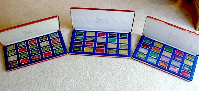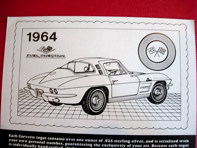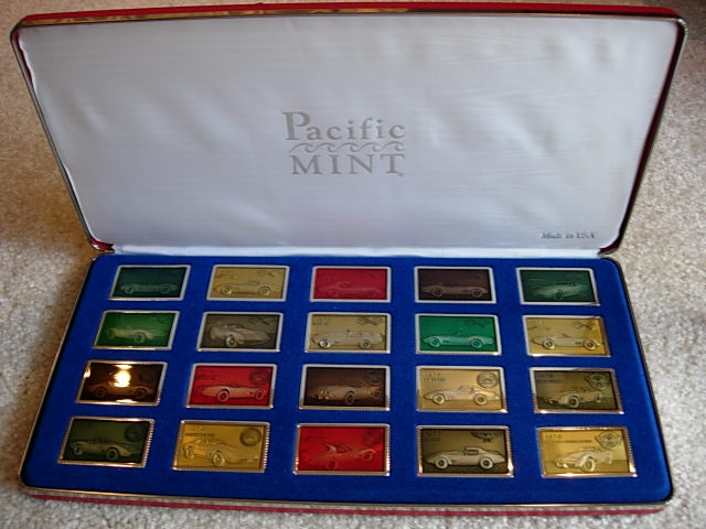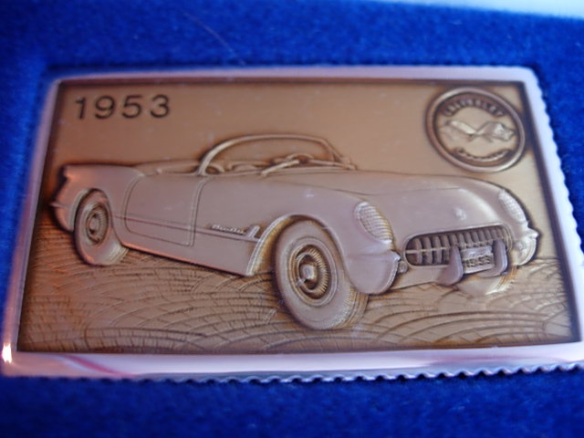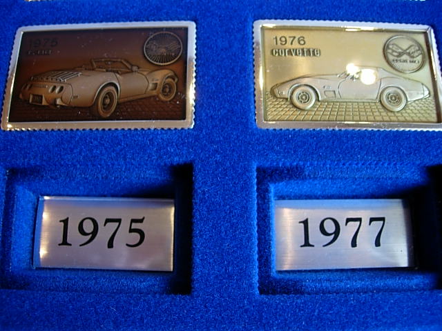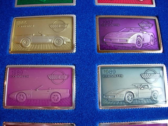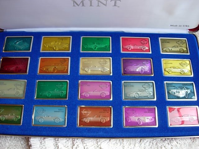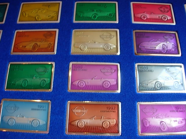 Unique set with large multi-color enamel coated silver ingots. The complete set was issued in 3 display cases of 20 ingots each, with ingots showing the best known Corvettes from different years starting with the original 1953 model. There was not one ingot for each model year - sometimes there were multiple ingots for a year and for some model years there are no ingots. The ingots were issued one at a time, and partial sets - especially one full case - are seen on occasion. I would rate the complete set of 60 ingots as 5-star rare.