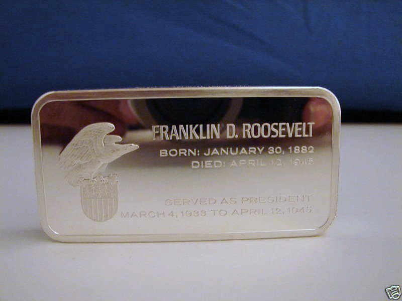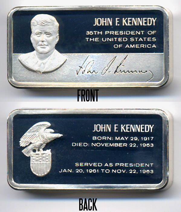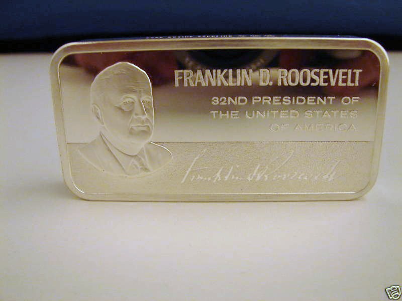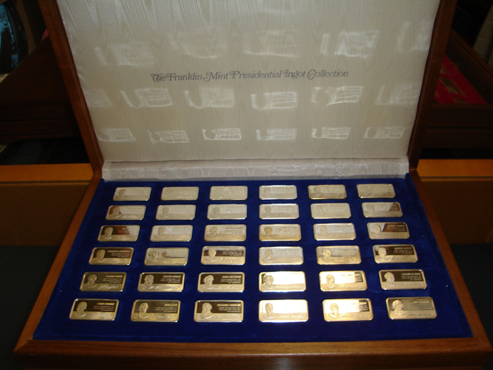These are the only presidential ingots the Franklin Mint made, although they also made several different types and sizes of presidential medals. The original sets included 36 ingots for presidents George Washington through Richard Nixon. The wood display case for this set is very attractive. Subscribers were later offered matching ingots for Gerald Ford and Jimmy Carter, but these ingots did not fit in the original display cases, and were quite a bit more expensive, so not many were sold and consequently these last two ingots are very rare. They are usually seen in individual boxes. The 5000 grain (approx. 10 oz) size ingot set is one of the few largest sets issued by the Franklin Mint. Subscribers to the set received Proof quality ingots; proof-like ingots for individual presidents were also available on an open stock basis - mintage numbers for these individual ingots are not available.